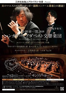 ■日時:2024年7月2日(火) 開演:19:00 (開場18:15) ■会場:サントリーホール 大ホール (東京都) 出演: 管弦楽:ハンガリー・ブダペスト交響楽団 指揮:小林研一郎 ピアノ:亀井聖矢 曲目: ロッシーニ:歌劇『セビリアの理髪師』序曲 リスト:ピアノ協奏曲第1番 変ホ長調 S.124/R.455 (ピアノ:亀井聖矢) チャイコフスキー:交響曲第4番 ヘ短調 作品36 チケット: S席:\15,000 A席:\12,000 B席:\10,000 P席:\8,000 お問合せ: テンポプリモ0335241221