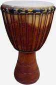 ジャンベの鼓面は鋲などを使って固定されておらず、ひもでくくりつけてあるだけです。鼓面の直径は30cmから40cm程度、胴の深さは80cm程度です。胴を横から見ると胴の上部は丸みを帯びており、中央がくびれている。ボディは木製で木の種類によって音色が変わる。