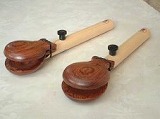 カスタネットの語源はギリシャ語で「栗」を表す「カスタネア」という単語です。ギリシャでは栗の木で作っていたからとも、形が栗の実に似ているからとも言われています。手のひらにおさまるくらいの丸い貝型の木片を2枚合わせて、これを打ち合わせることによって音を出す楽器です。